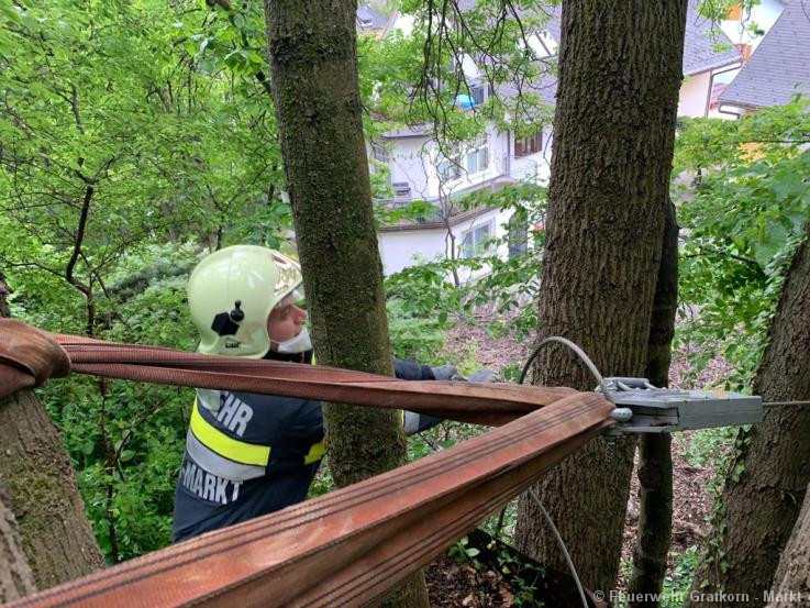 Der Baum wurde mittels Greifzug in eine sichere Position gebracht und anschließend mittels Motorsäge abgetragen.