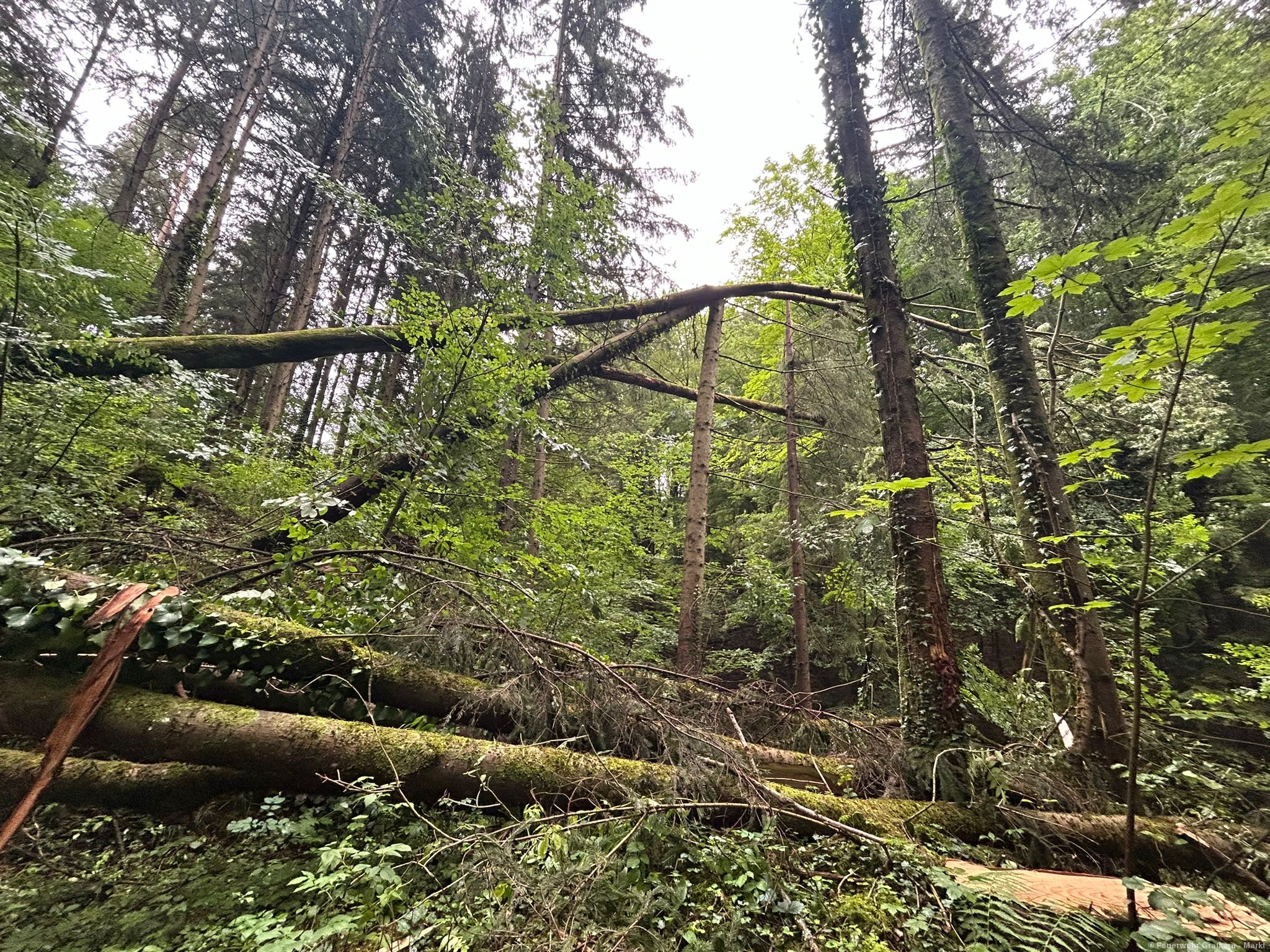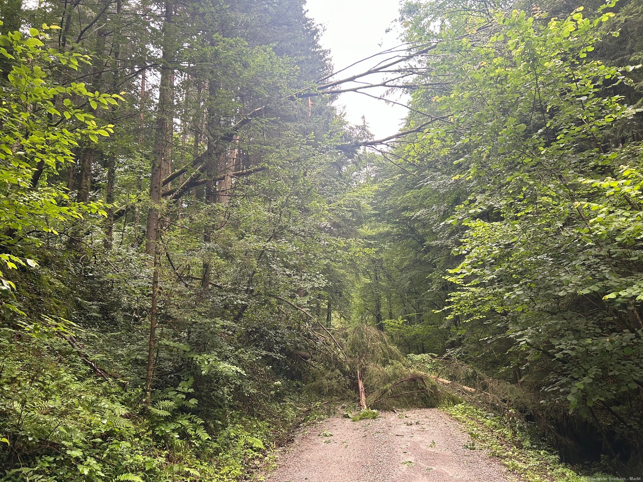 Es handelt sich um mehrere umgefallene Bäume, die das passieren der Straße verhindern.