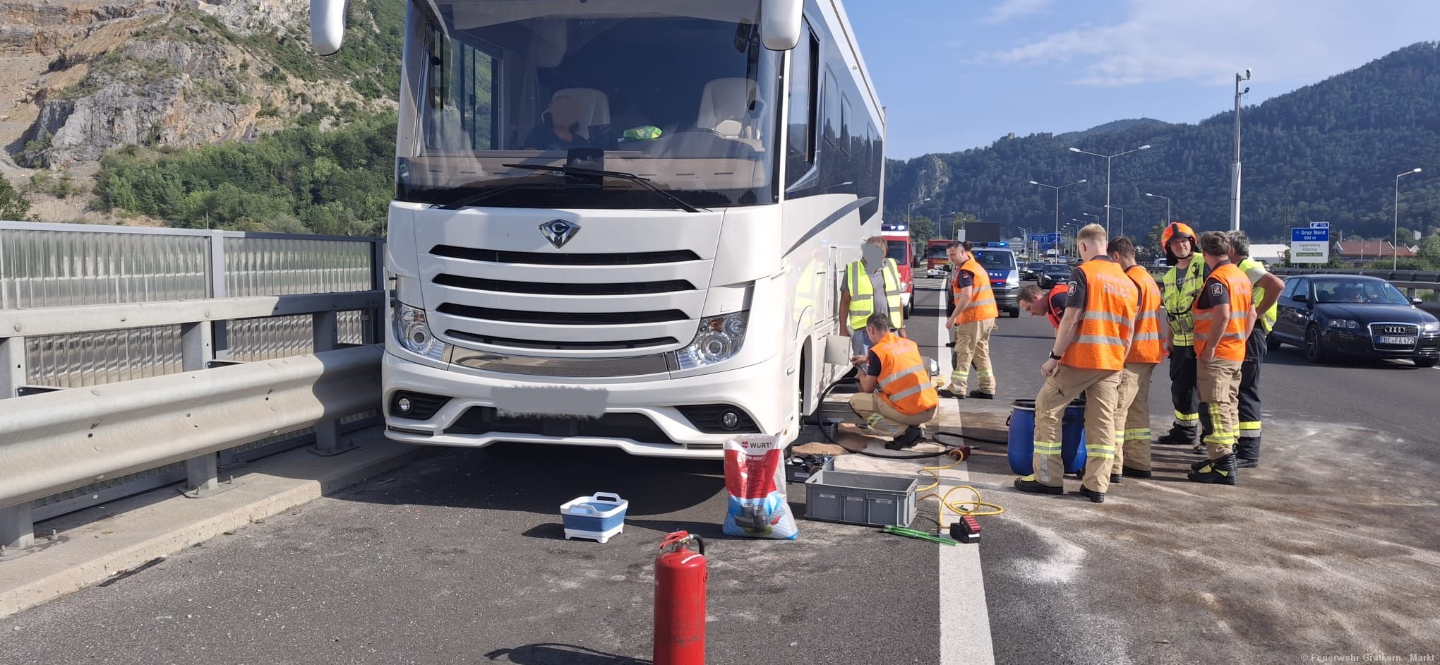 Es handelte sich um ein großes Wohnmobil, mit einem undichten Dieseltank. Das Fahrzeug verlor um die 100l Diesel.
