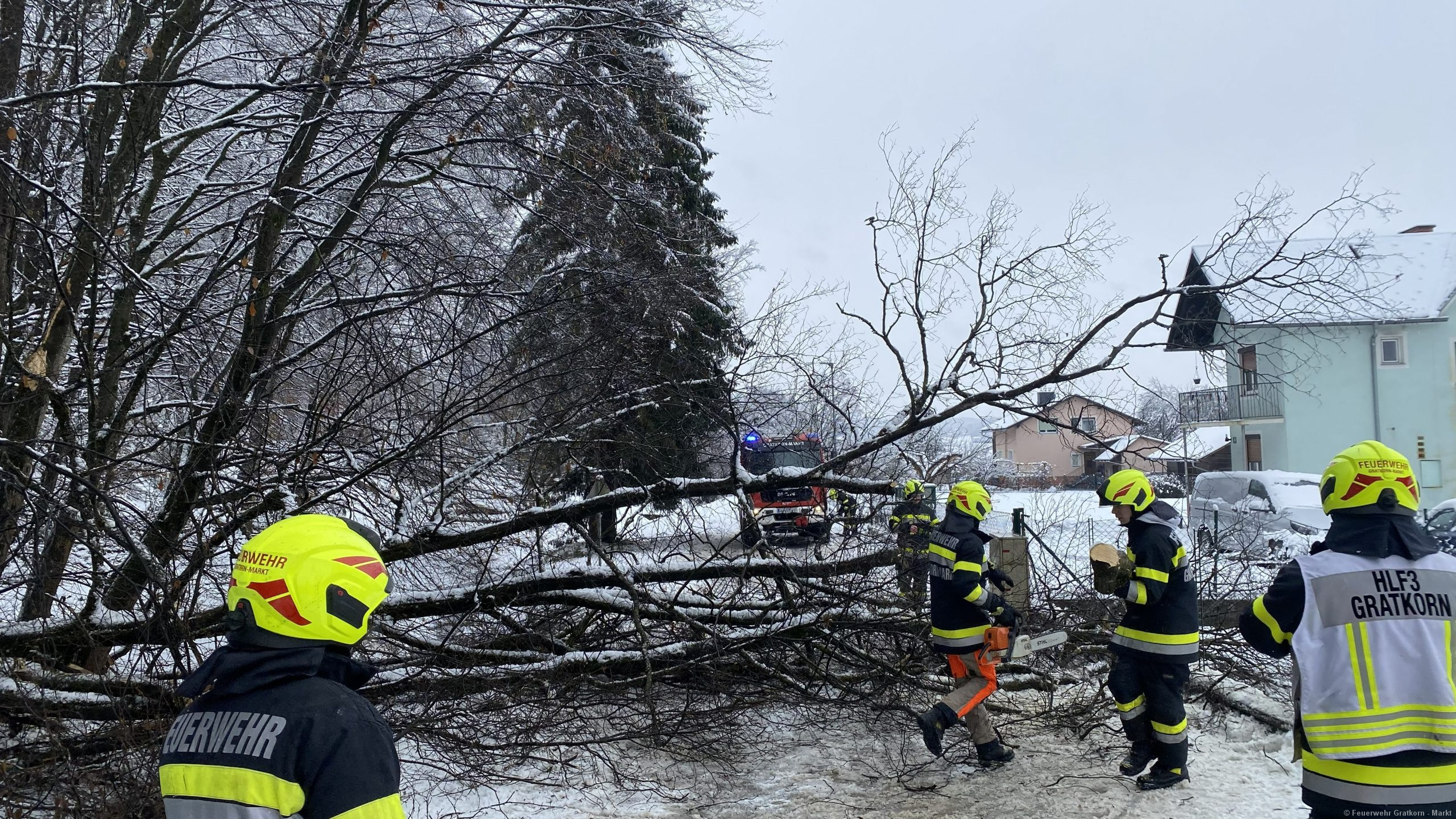 Die Freiwillige Feuerwehr Gratkorn-Markt wurde zu mehreren Unwettereinsätzen durch Schneebruch im Ortsgebiet alarmiert.
