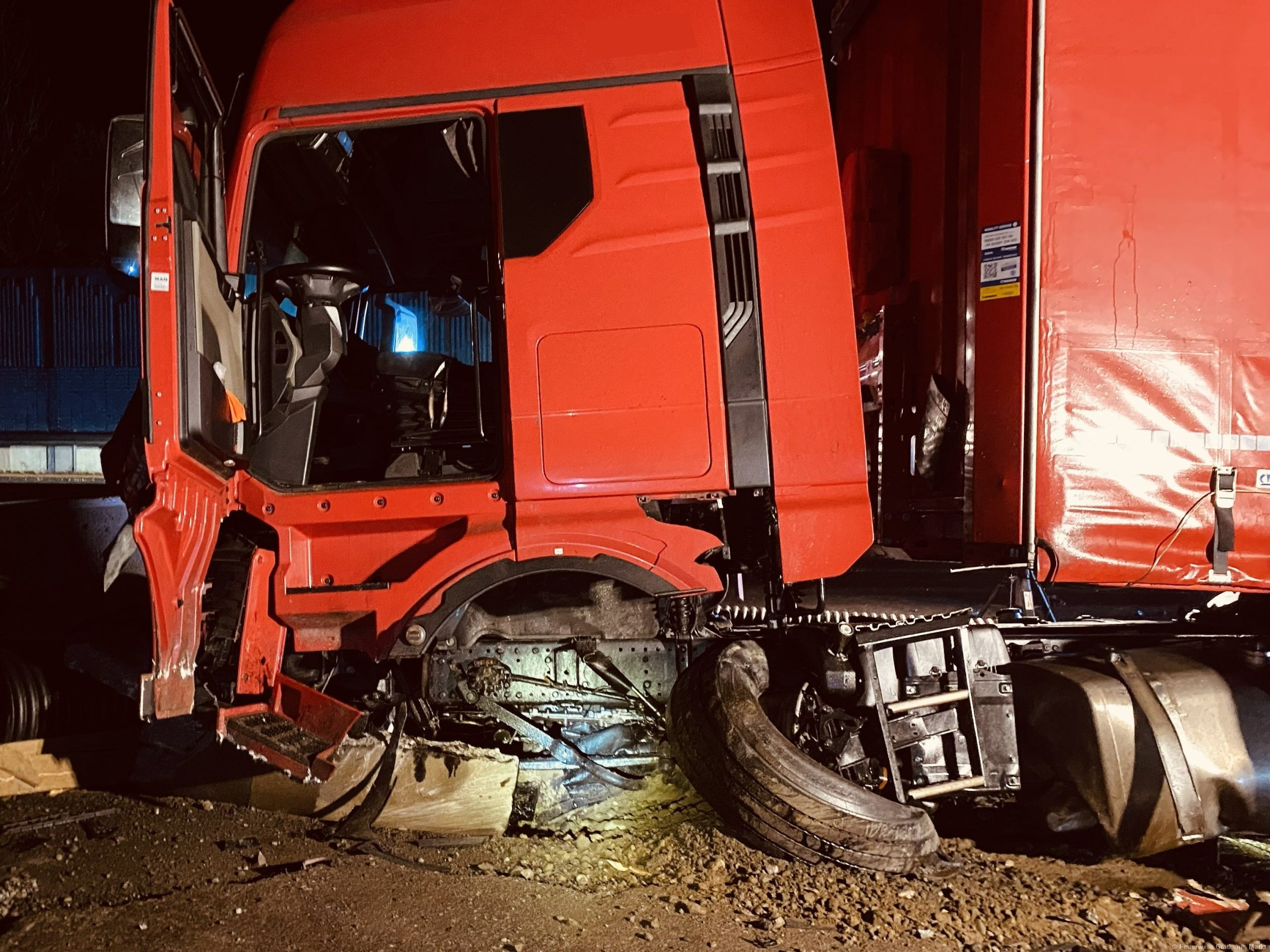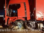 LKW im Baustellenbereich von der Fahrbahn abgekommen. Austritt von Betriebsmitteln auf ca. 200m aufgrund eines beschädigten Dieseltanks und zerstörten Motorblocks. Keine Person mehr im Fahrzeug. Polizei vor Ort.