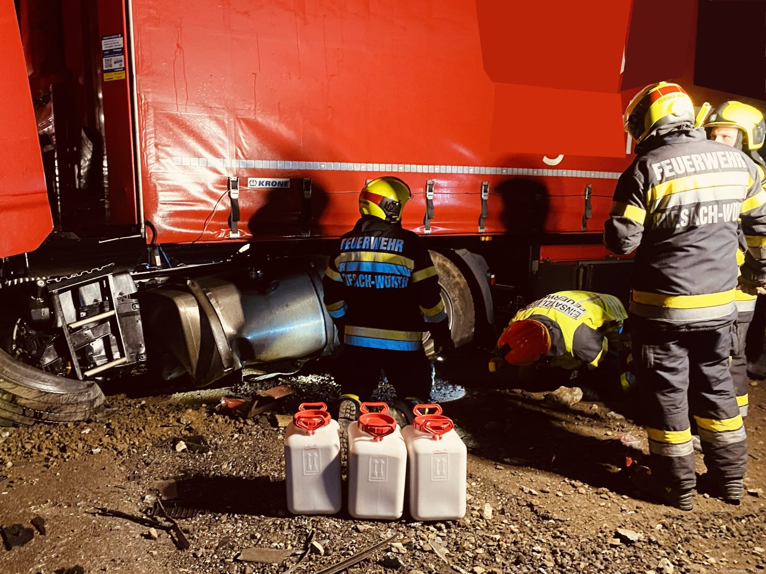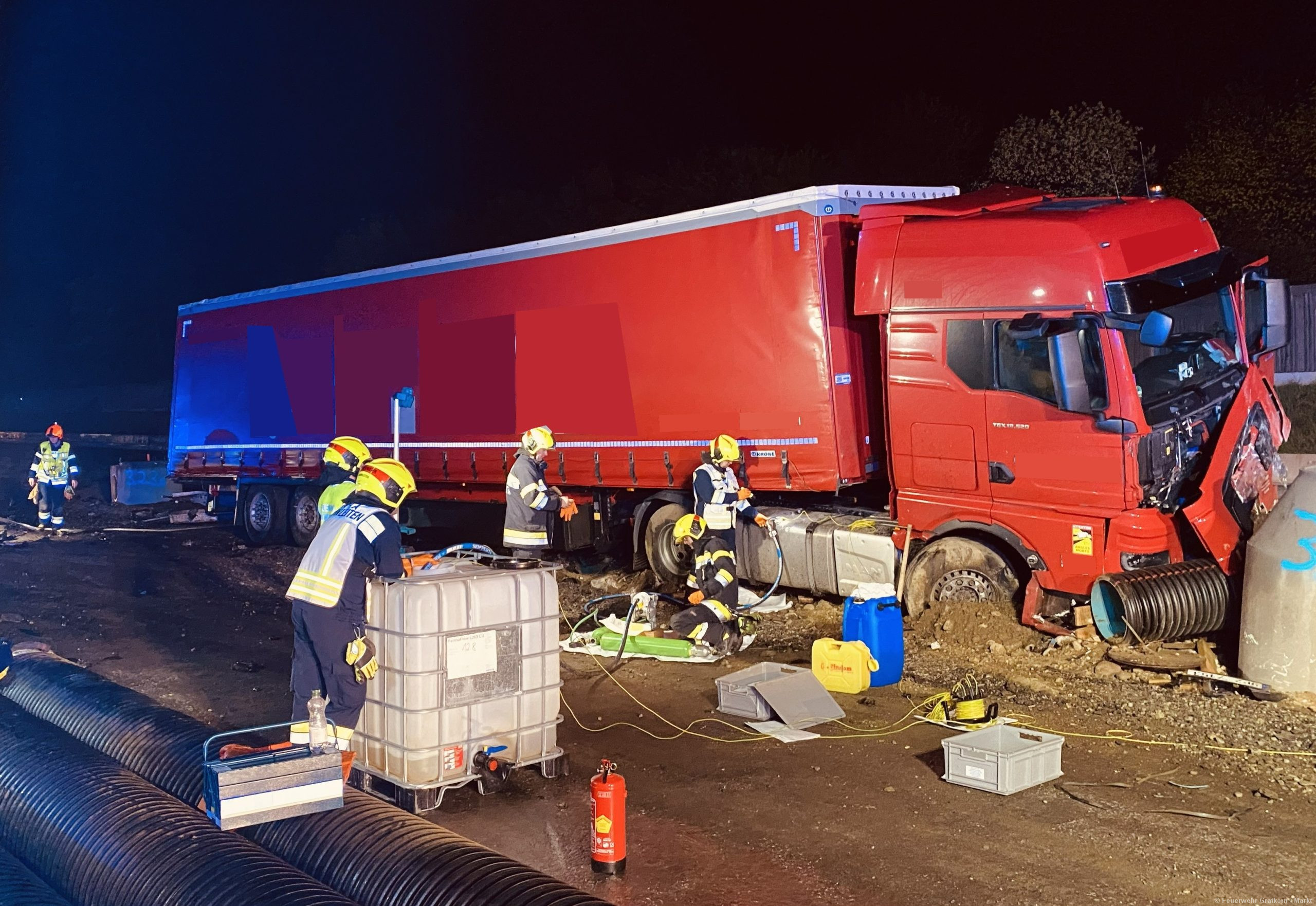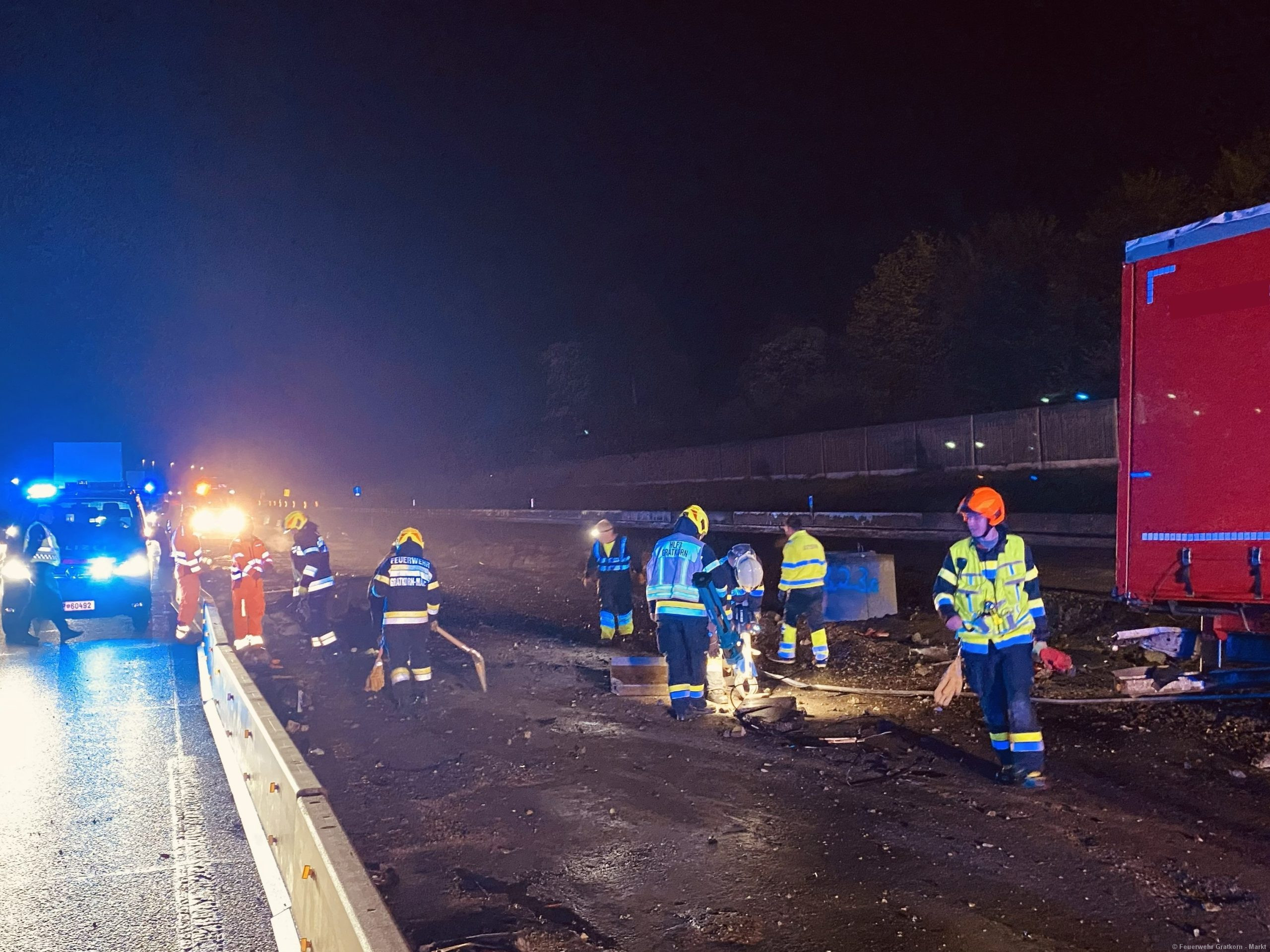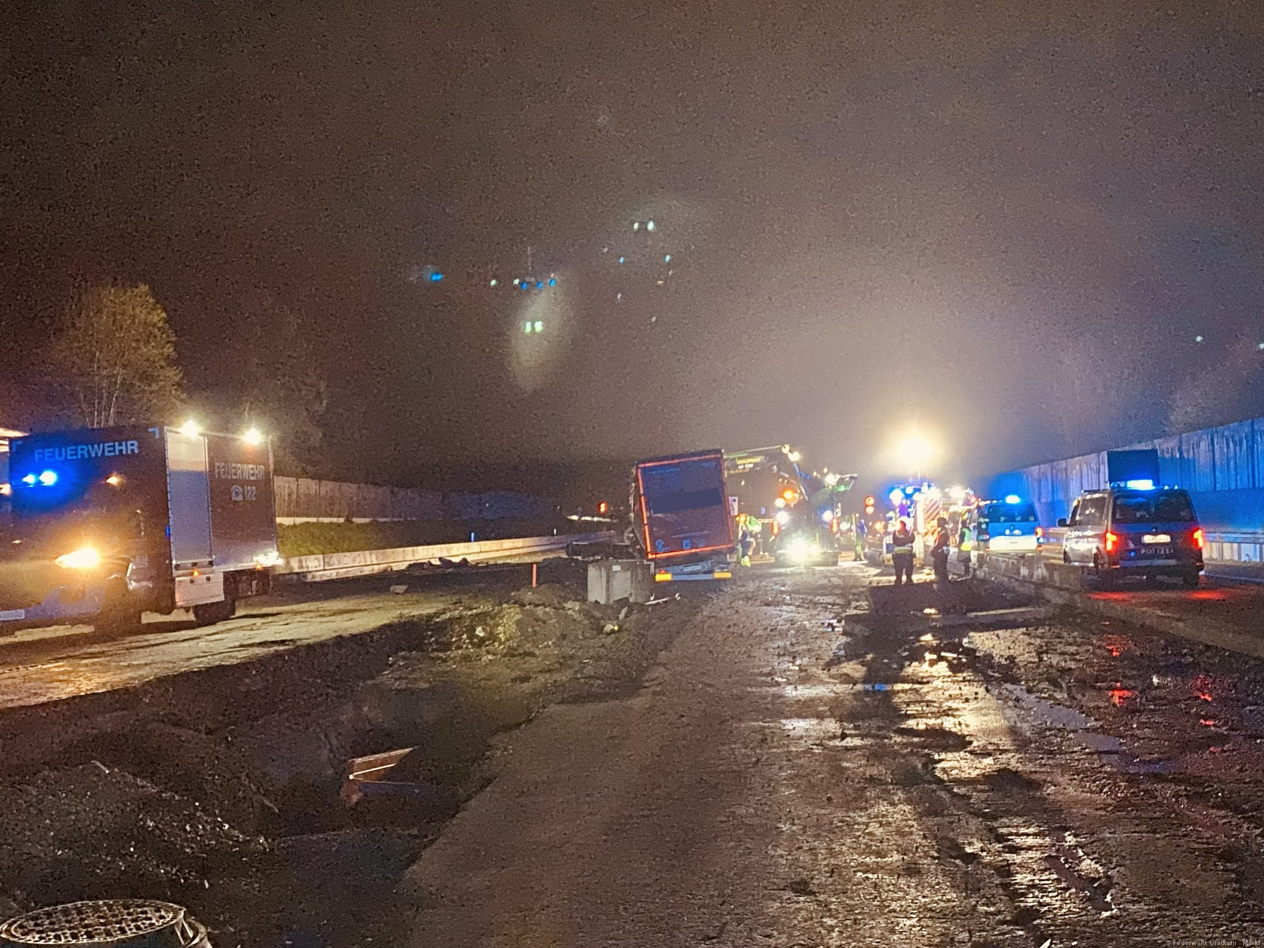 Absichern und Ausleuchten der Einsatzstelle. Aufbauen eines 3-fachen Brandschutzes. Binden und Auffangen von Betriebsmitteln. Freimachen der Verkehrswege von Beton und Metalltrümmern. Abpumpen beider Dieseltanks in einen IBC-Container mittels Druckluftmembranpumpe des ÖF-Frohnleiten. Begehung der Einsatzstelle mit dem Chemiealarmdienst und der ASFINAG. Einsatzstelle an die ASFINAG übergeben. Reinigung der Ausrüstung von Betriebsmittelrückständen.