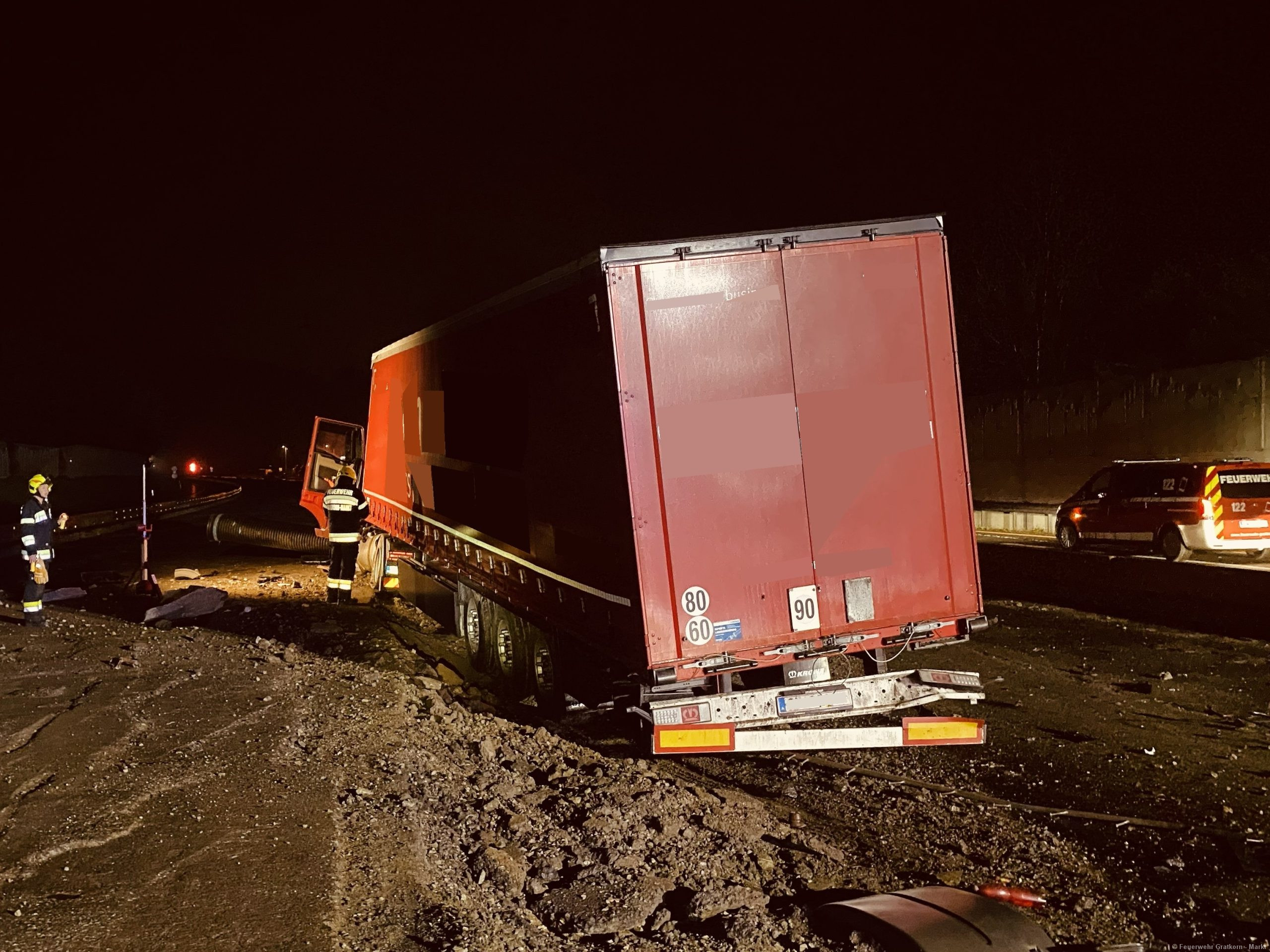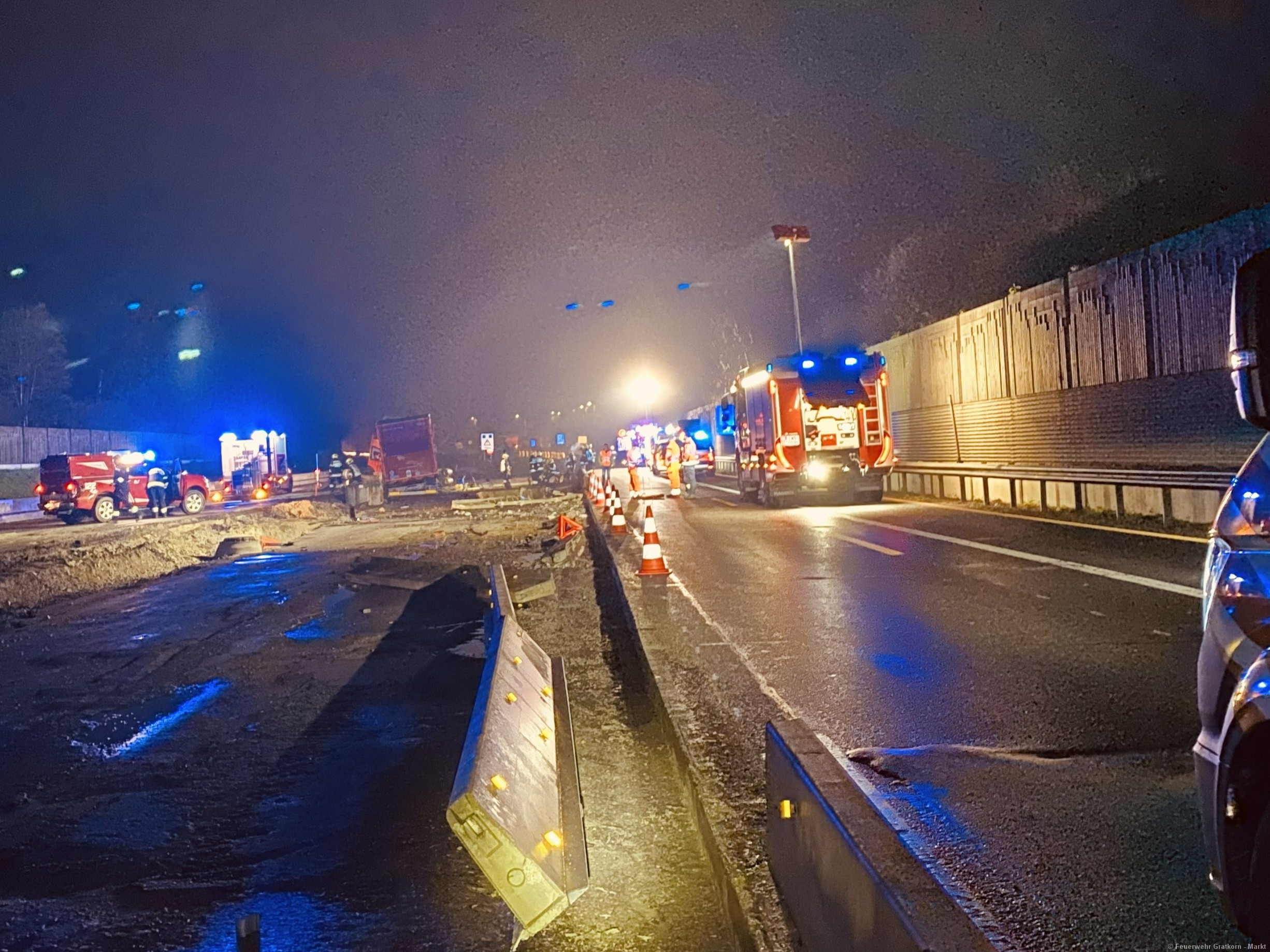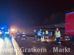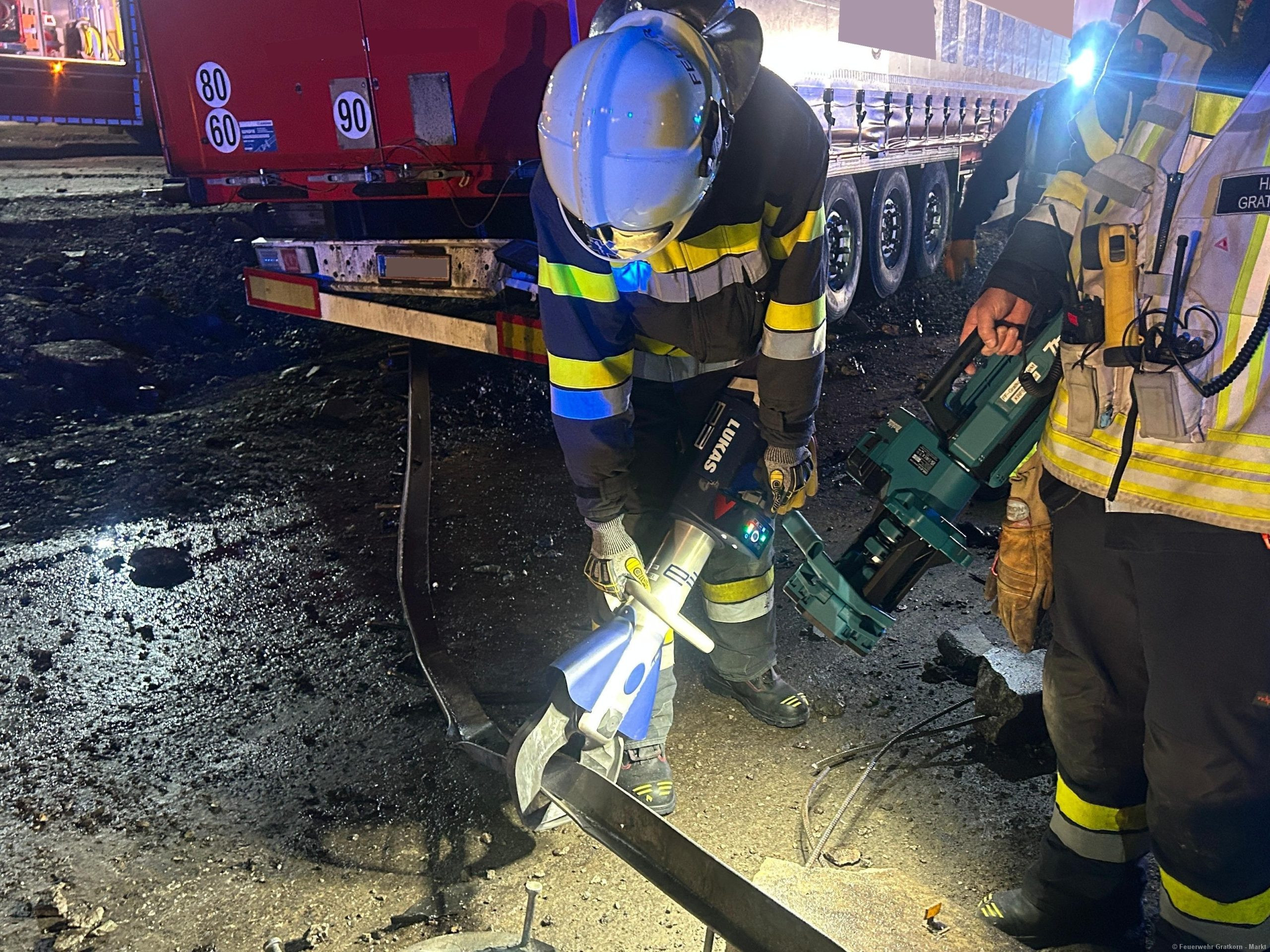 Absichern und Ausleuchten der Einsatzstelle. Aufbauen eines 3-fachen Brandschutzes. Binden und Auffangen von Betriebsmitteln. Freimachen der Verkehrswege von Beton und Metalltrümmern. Abpumpen beider Dieseltanks in einen IBC-Container mittels Druckluftmembranpumpe des ÖF-Frohnleiten. Begehung der Einsatzstelle mit dem Chemiealarmdienst und der ASFINAG. Einsatzstelle an die ASFINAG übergeben. Reinigung der Ausrüstung von Betriebsmittelrückständen.